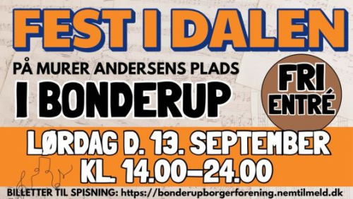 Så er vi klar til endnu en omgang Fest i Dalen. En skøn og GRATIS dagsfestival, i hjertet af Bonderup, på Murer Andersens Plads. Gratis livemusik 14 - 24. Der er mulighed for at købe menu, som udleveres på dagen.